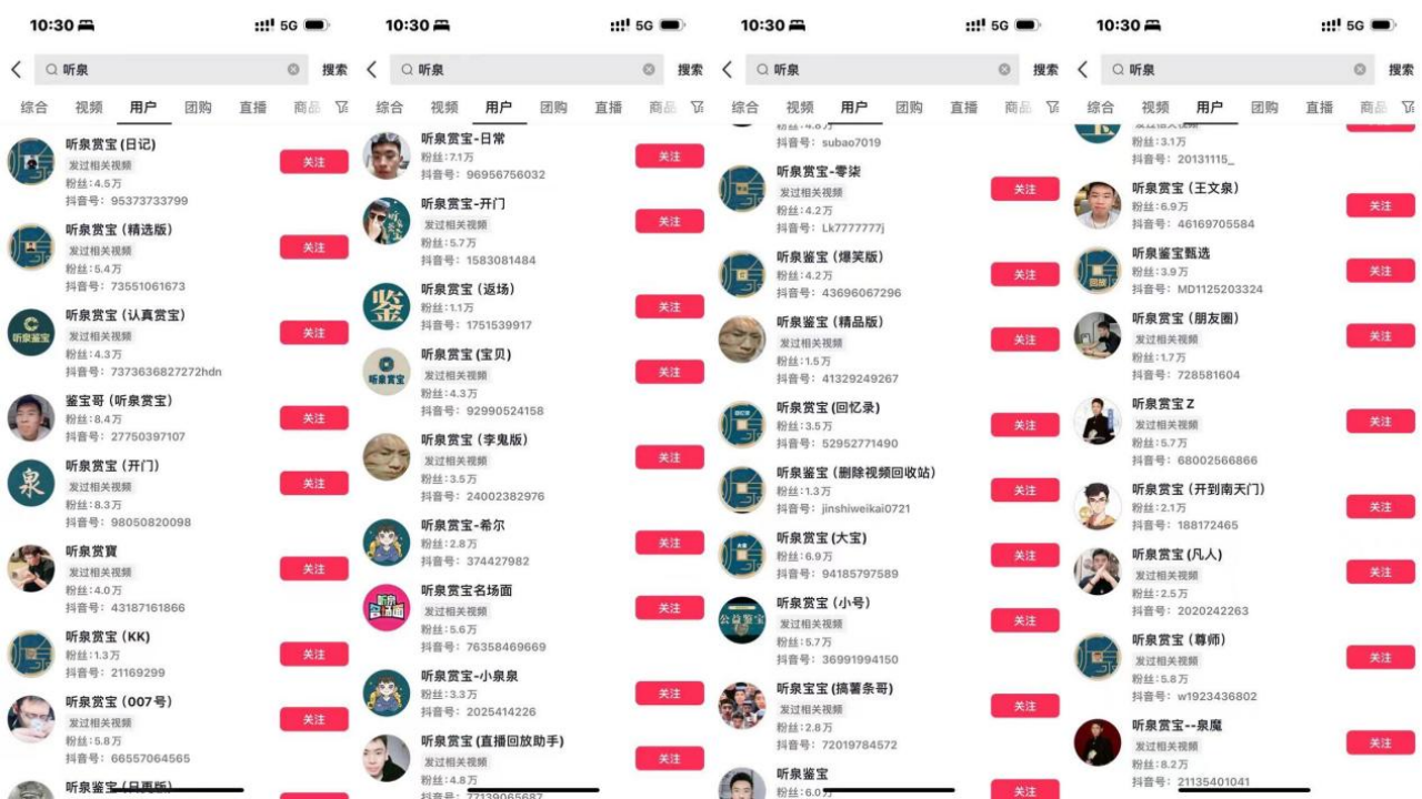 對抖音另一個頭部主播聽泉鑒寶來說,直播切片的助力更加明顯,單單在抖音平臺,聽泉鑒寶的粉絲量就高達3500萬,是實打?qū)嵉某痪€現(xiàn)象級主播。