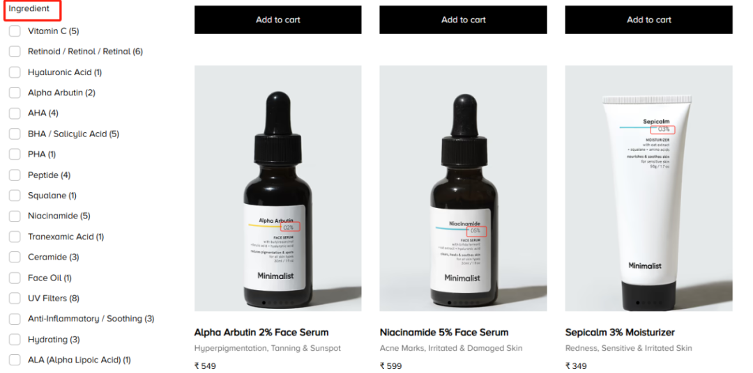 據(jù)了解,Minimalist最突出的特點在于D2C銷售模式和主打功效活性成分。從Minimalist官網(wǎng)可以看到,該品牌旗下大部分產(chǎn)品均在包裝外側(cè)標(biāo)注了料體主要成分的濃度及功效。不僅如此,該網(wǎng)站還單獨設(shè)置了成分選擇欄,其中包括維生素C、視黃醇、透明質(zhì)酸、肽等,消費者可以通過篩選成分以購買不同功效的產(chǎn)品。