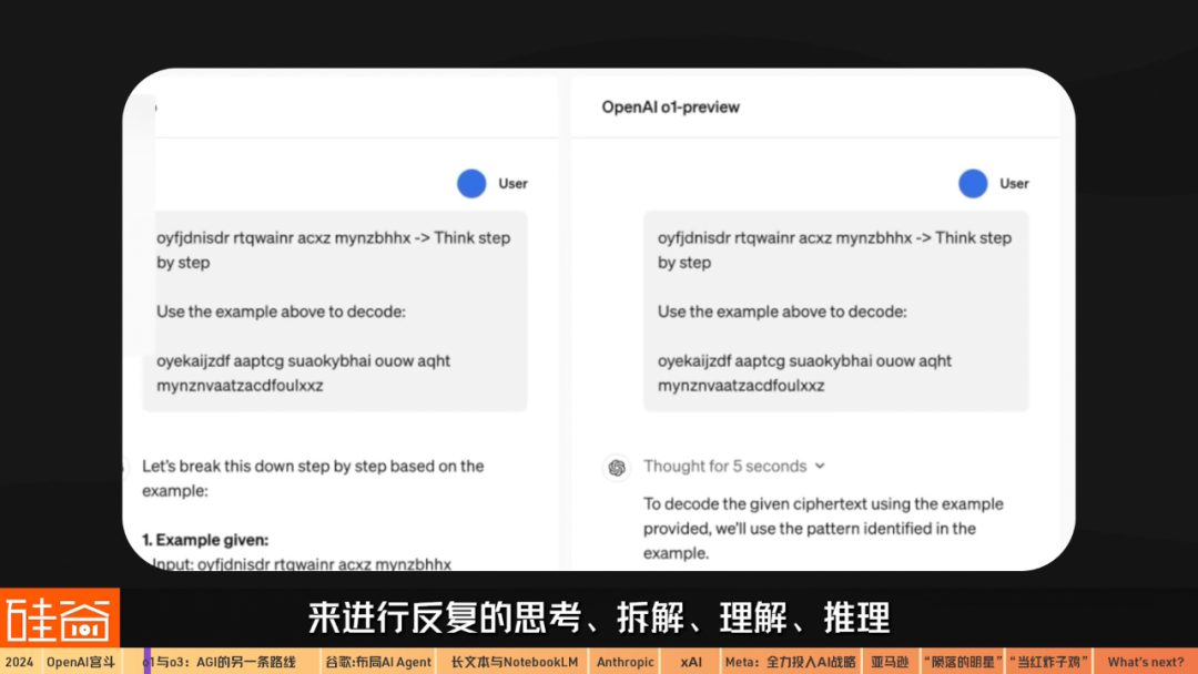簡(jiǎn)單來說,o1學(xué)會(huì)了人類的“慢思考”,包括利用思維鏈(Chain of Thought,簡(jiǎn)稱CoT)來進(jìn)行反復(fù)的思考、拆解、理解、推理,然后給出最終答案。這使得AI的推理能力在處理科學(xué)、編碼、數(shù)學(xué)及類似領(lǐng)域的復(fù)雜問題時(shí)有了飛躍的進(jìn)步。