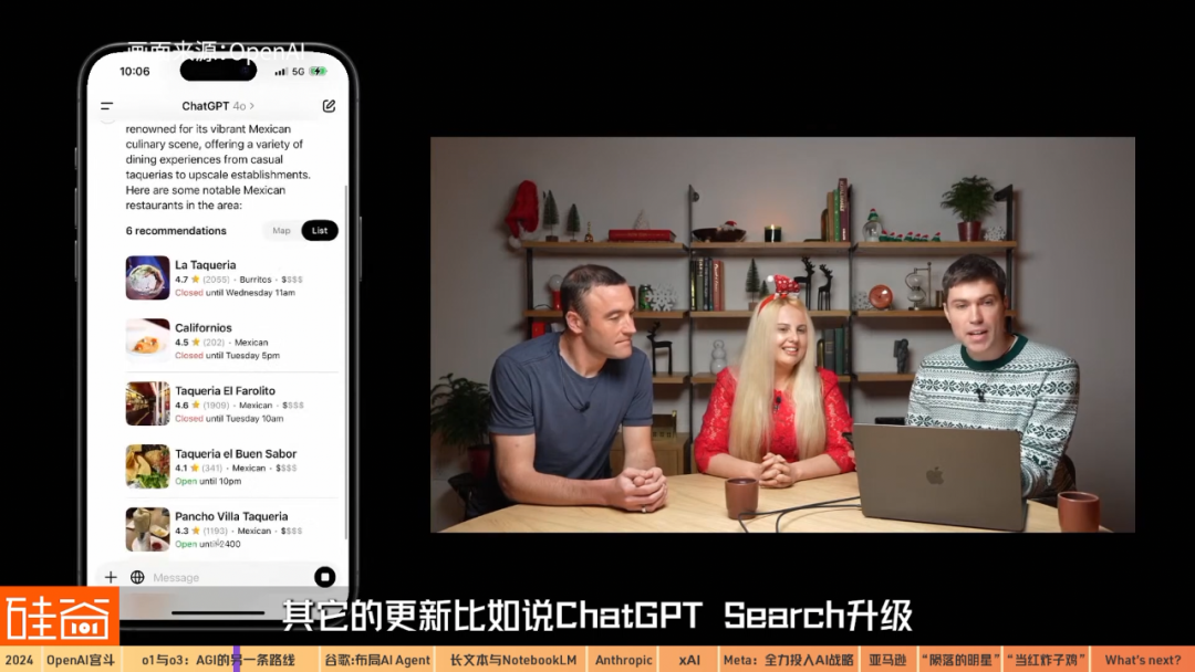 這12天的發(fā)布活動(dòng)中,除了前幾天的o1正式版、生成視頻模型Sora在歷經(jīng)10個(gè)月之后終于開放給公眾、以及集智能寫作、代碼寫作和定制化AI agent為一體的AI工作臺(tái)Canvas之外,其它的更新比如說ChatGPT Search升級(jí)、與蘋果Apple Intelligence的協(xié)作等等,看上去就非常不痛不癢,甚至感覺是在給12天的發(fā)布會(huì)湊數(shù)。