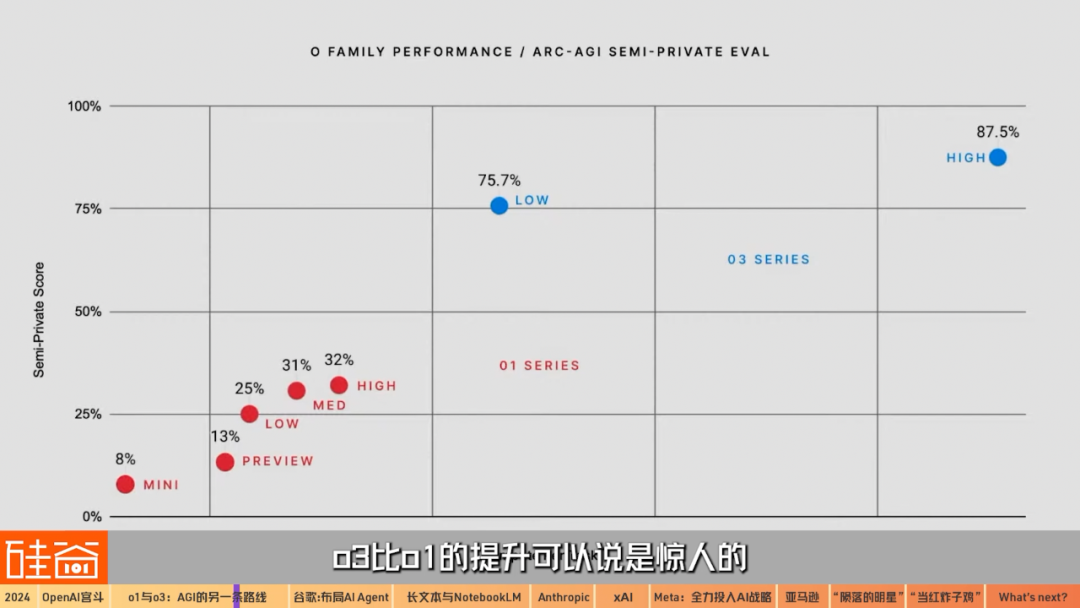 o3在數(shù)個(gè)測(cè)試上的能力,無論是程序員編碼競(jìng)賽(Codeforces)中超過99%的人類程序員,還是博士水平的科學(xué)問題(GPQA)已經(jīng)超過一般人類博士生,還是最難的前沿?cái)?shù)學(xué)測(cè)試,還是抽象推理能力基準(zhǔn)考試ARC-AGI,o3比o1的提升可以說是驚人的,而這個(gè)版本的更新僅僅用了三個(gè)月的時(shí)間。