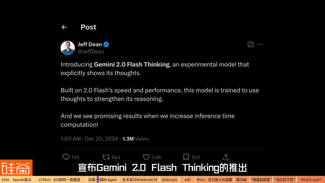 12月20日,Google Brain團(tuán)隊(duì)負(fù)責(zé)人Jeff Dean宣布Gemini 2.0 Flash Thinking的推出——直接對(duì)標(biāo)OpenAI的o1路線,展現(xiàn)出谷歌內(nèi)部對(duì)思維鏈技術(shù)(CoT)的能力,并且Gemini 2.0 Flash Thinking的思考速度會(huì)比o1-mini要快。