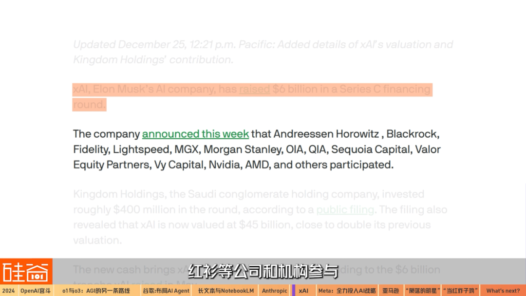 12月24日,馬斯克旗下的xAI宣布完成60億美元的C輪融資。英偉達(dá),AMD,a16z,紅衫等公司和機(jī)構(gòu)參與,也表明業(yè)界對(duì)xAI的潛力的看好。