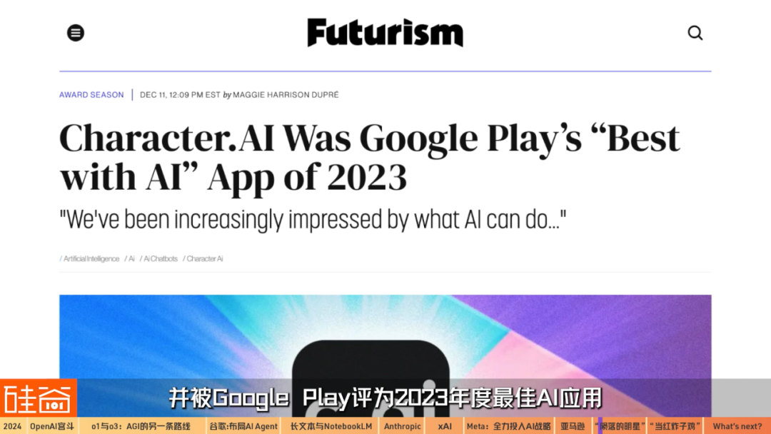 2023年5月,Character.AI在蘋果App Store和Google Play Store發(fā)布了移動(dòng)應(yīng)用程序,第一周下載量就超過170萬次,并被Google Play評(píng)為2023年度最佳AI應(yīng)用。