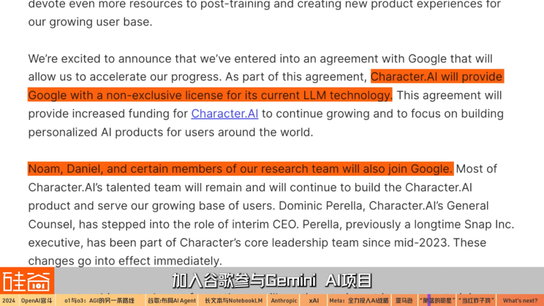 2024年8月,Character.AI宣布,谷歌已經(jīng)同意向Character.AI支付模型授權(quán)費(fèi),并將讓Character.AI聯(lián)合創(chuàng)始人兼CEO Noam Shazeer、總裁Daniel De Freitas、以及30名Character從事模型訓(xùn)練和語音AI工作的員工,加入谷歌參與Gemini AI項(xiàng)目,谷歌為此支付的價(jià)格是25億美元。