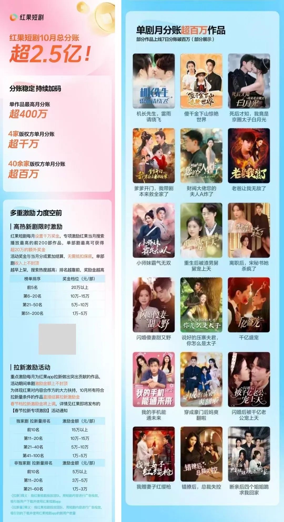 而在2024年,以紅果短劇為代表的免費(fèi)短劇APP異軍突起。截至2024年11月,紅果短劇的月活已突破1.4億。2024年6月,紅果短劇的總分賬金額超過(guò)1億元,而到了9月,分賬金額持續(xù)超過(guò)2億元。截至2024年10月,平臺(tái)的總分賬金額超過(guò)2.5億元。