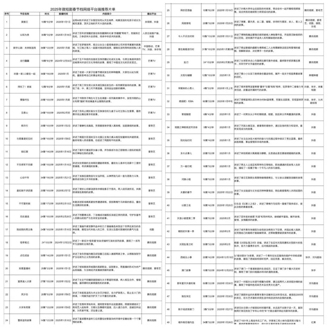 時間播回當下,國家廣播電視總局在近日發(fā)布了「微短劇陪你過大年」2025年微短劇春節(jié)檔推薦片單,抖、快以及愛優(yōu)騰芒的多部獨播作品皆在其中。
