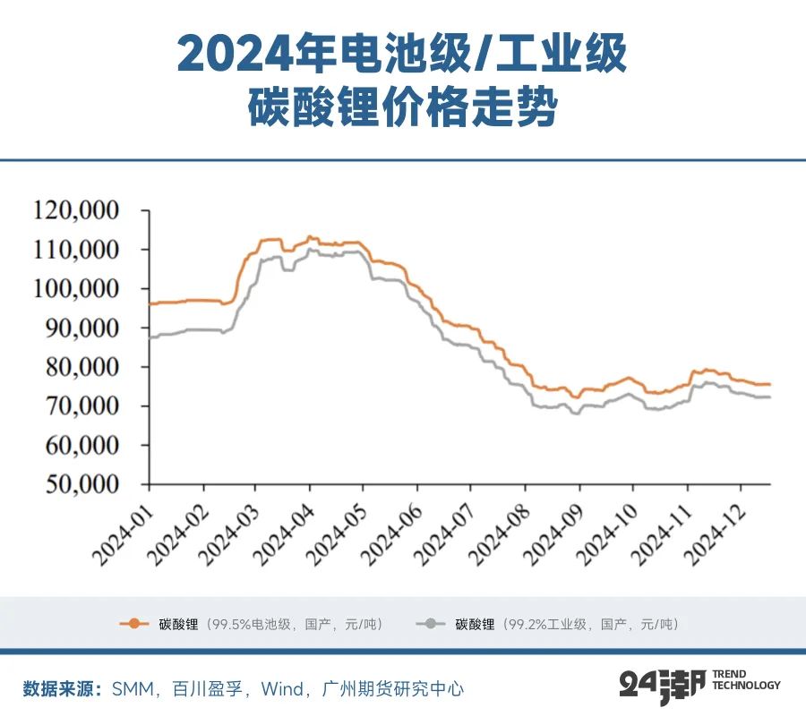 特別是在市場(chǎng)對(duì)供給過剩預(yù)期確定性較高的背景下,24年年內(nèi)雖有數(shù)次因供給端擾動(dòng)引發(fā)的短期反彈,但始終未能改變整體空頭趨勢(shì)。盤面表現(xiàn)不斷探底,10月期價(jià)跌破(2023年)前低至6.97萬元/噸后逐漸企穩(wěn)并有所回升。截至2024年12月31日,碳酸鋰主力合約收于7.33萬元/噸,較年初下跌32%。全年鋰價(jià)整體仍處于熊市周期。