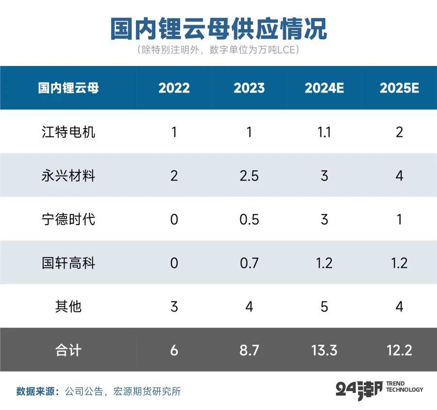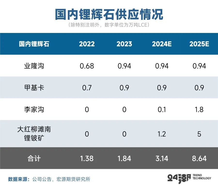 而鋰云母項(xiàng)目上半年受到環(huán)保政策影響停產(chǎn)待工情況較多,三季度國內(nèi)鋰業(yè)巨頭寧德時(shí)代宣布梘下窩礦以及其冶煉廠停產(chǎn),對(duì)鋰云母資源供給產(chǎn)生一定擾動(dòng)。整體來看,2024年我國云母提鋰資源實(shí)現(xiàn)了增長(zhǎng),鋰云母與鋰輝石合計(jì)預(yù)計(jì)貢獻(xiàn)16.4萬噸LCE左右。