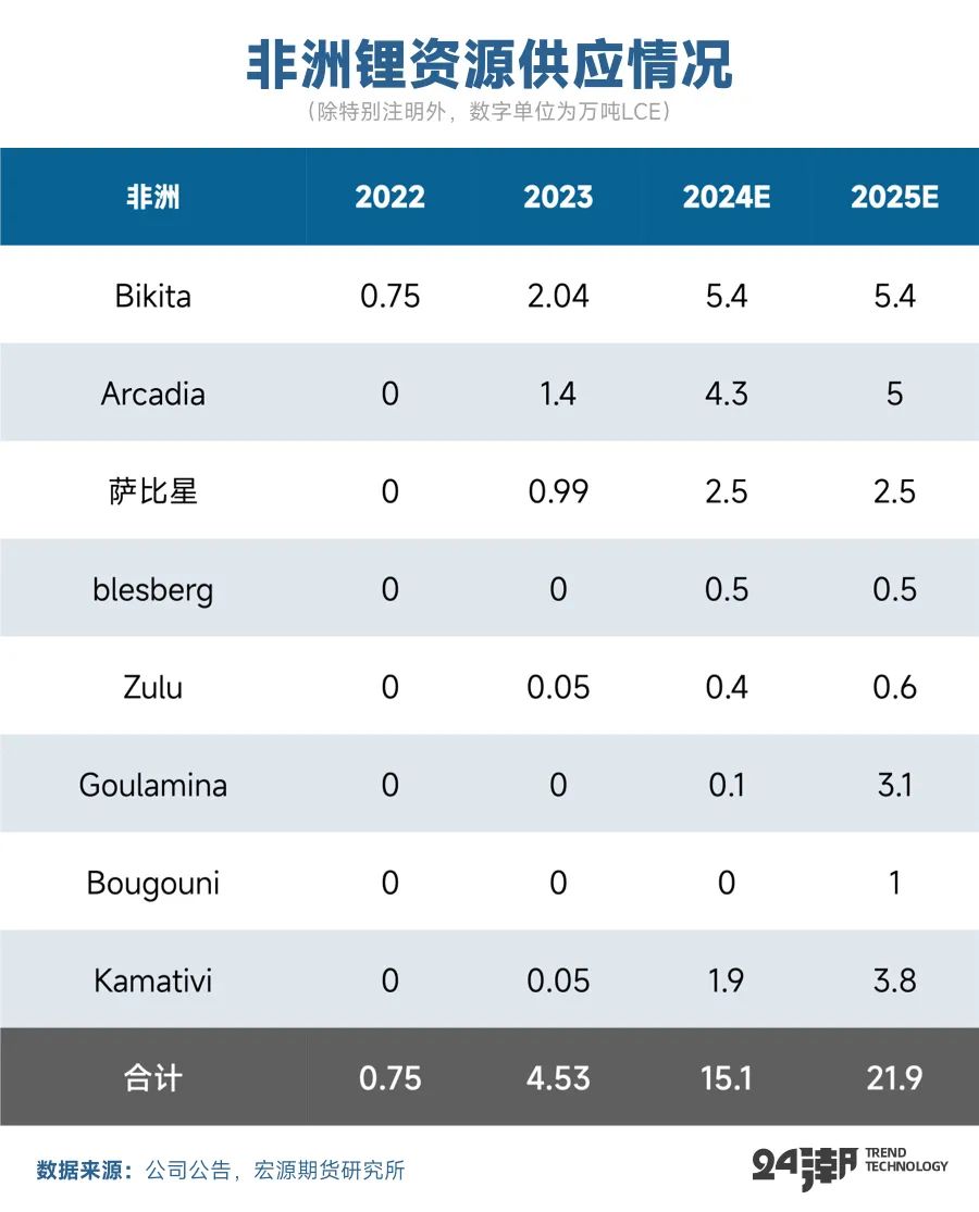 非洲鋰礦近年來嶄露頭角,成為全球鋰資源供給中的新興力量,主要分布在剛果、馬里、津巴 布韋和尼日利亞等地,并吸引了大量投資。由中國企業(yè)主導(dǎo)開發(fā)的Arcadia、Bikita、薩比星等項(xiàng)目在2023-2024年間實(shí)現(xiàn)產(chǎn)能釋放。贛鋒鋰業(yè)控股的Goulamina項(xiàng)目則于2024年第三季度投產(chǎn),25年將進(jìn)一步放量。雅化的Kamativi項(xiàng)目已完成一階段建設(shè),所產(chǎn)鋰精礦已運(yùn)回國內(nèi)用于生產(chǎn),2024年全面完成二階段建設(shè),25年仍將持續(xù)放量。海南礦業(yè)的Bougouni項(xiàng)目12月16日在選礦廠舉行首次投料試車儀式,標(biāo)志著該項(xiàng)目正式進(jìn)入調(diào)試階段,預(yù)計(jì)將于2025年初實(shí)現(xiàn)投產(chǎn)。根據(jù)宏源期貨的數(shù)據(jù),24年非洲鋰資源的供應(yīng)量約為15萬噸(折LCE),同比增長(zhǎng)233%,25年非洲鋰資源的供應(yīng)量進(jìn)一步增長(zhǎng)至21.9萬噸(折LCE),同比增長(zhǎng)約45%。
