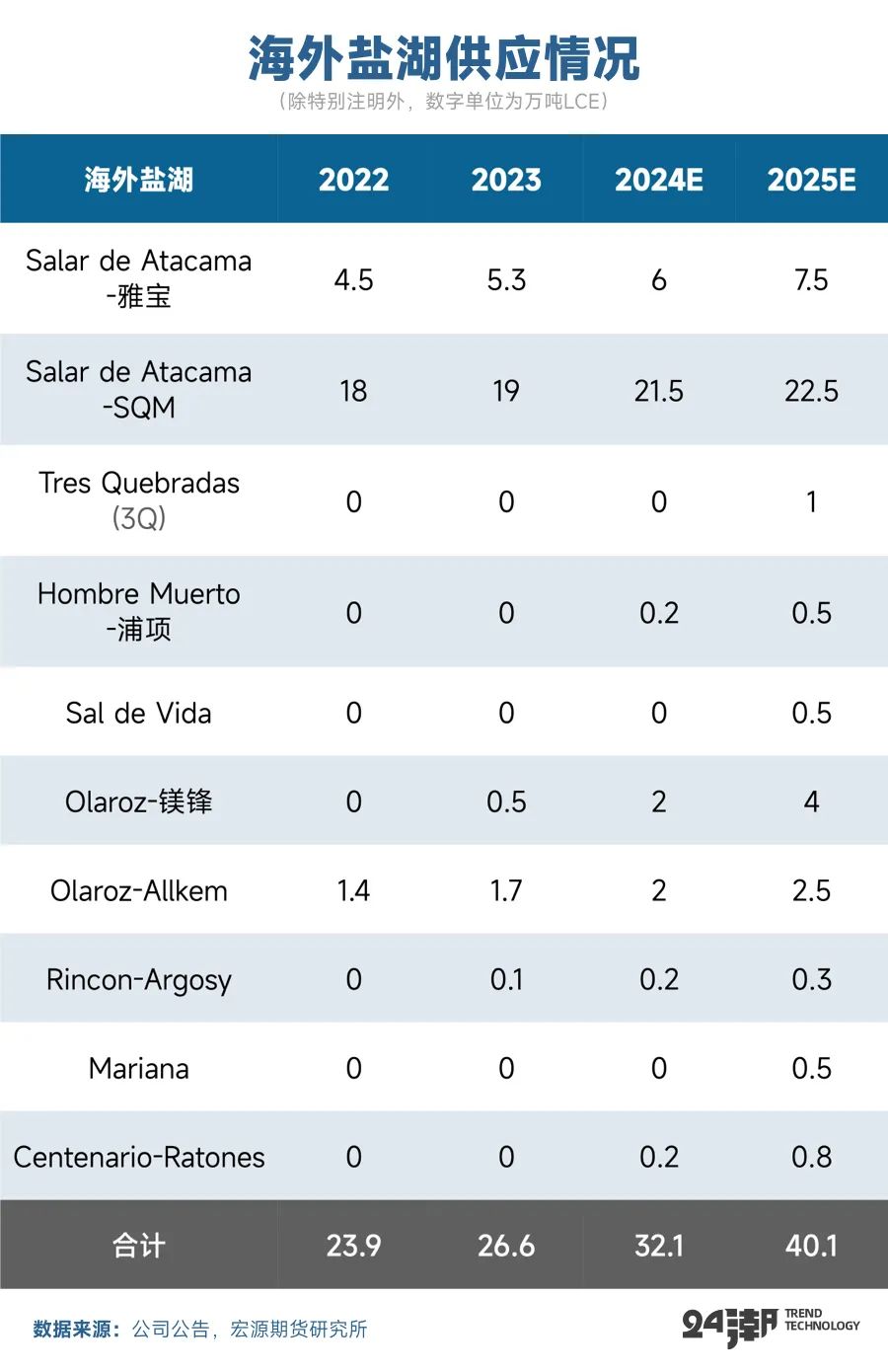 海外方面,南美目前對(duì)碳酸鋰產(chǎn)量貢獻(xiàn)最大的仍是ALB和SQM在智利的Atacama鹽湖項(xiàng)目,明年由于不少項(xiàng)目逐漸爬坡以及釋放產(chǎn)能,整體鹽湖產(chǎn)量將進(jìn)一步快速釋放。今年一季度SQM已經(jīng)完成了Atacama項(xiàng)目1萬噸擴(kuò)建工程,產(chǎn)能持續(xù)提升;ALB-Atacama近兩年擴(kuò)產(chǎn)4萬噸,2025年預(yù)計(jì)將繼續(xù)爬坡。盡管紫金旗下3Q項(xiàng)目進(jìn)展不及預(yù)期,目前或延期至2025年中投產(chǎn),但POSCO的Sal de Oro已于10月順利投產(chǎn),Centenario也于12月正式投產(chǎn)。此外Olaroz、Hombre Muerto等項(xiàng)目的爬坡也會(huì)進(jìn)一步增加25年產(chǎn)能的釋放。根據(jù)宏源期貨的數(shù)據(jù),2025年以南美鹽湖為主的海外鹽湖供應(yīng)將達(dá)到40萬噸(折LCE),同比增長(zhǎng)約25%。