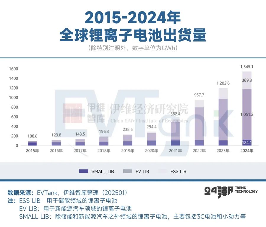 據(jù)研究機(jī)構(gòu)EVTank聯(lián)合伊維經(jīng)濟(jì)研究院共同發(fā)布的《中國鋰離子電池行業(yè)發(fā)展白皮書(2025年)》顯示,2024年全球鋰離子電池總體出貨量1545.1GWh,同比增長(zhǎng)28.5%。從出貨結(jié)構(gòu)來看,全球汽車動(dòng)力電池(EV LIB)出貨量為1051.2GWh,同比增長(zhǎng)21.5%;儲(chǔ)能領(lǐng)域,全球儲(chǔ)能電池(ESS LIB)出貨量369.8GWh,同比增長(zhǎng)64.9%,主要是由于2024年中國新能源強(qiáng)配政策、央國企強(qiáng)化布局及儲(chǔ)能成本不斷下探,帶動(dòng)ESS保持超高速增長(zhǎng);美國配儲(chǔ)剛性需求疊加ITC補(bǔ)貼的效果明顯,此外新興市場(chǎng)多點(diǎn)爆發(fā),2024下半年英國、沙特、澳大利亞等簽訂多個(gè)GWh訂單,帶動(dòng)24年儲(chǔ)能電池增速可觀。