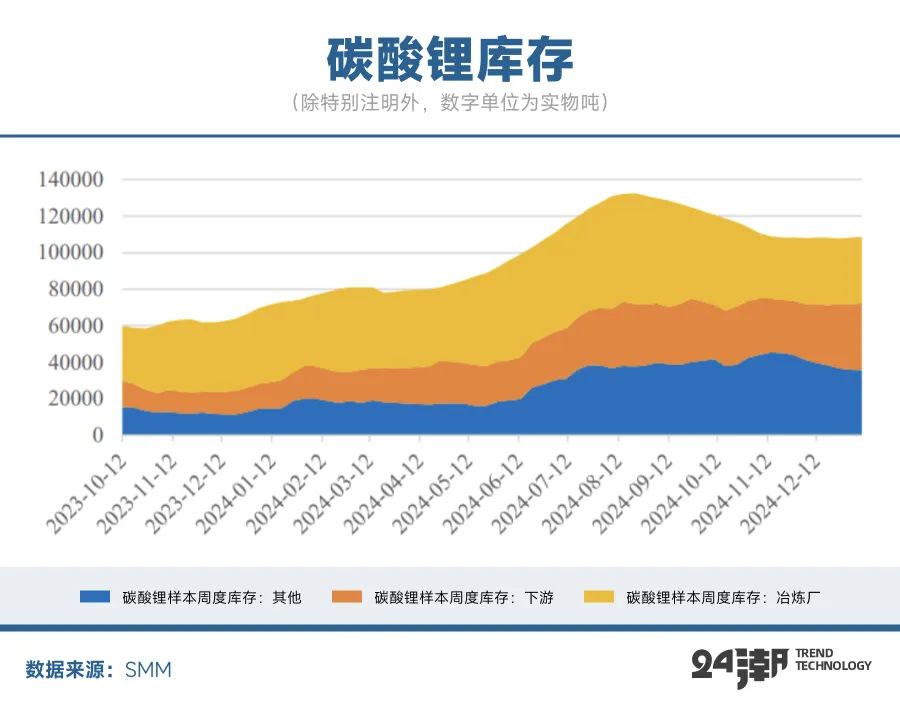 碳酸鋰庫存累積是行業(yè)庫存的重要指標(biāo),24年以來碳酸鋰庫存不斷累積,在市場(chǎng)對(duì)未來供給寬松及鋰價(jià)下跌預(yù)期較為確定的背景下,庫存重心大幅上移,前三季度持續(xù)處于累庫階段,進(jìn)入24年四季度有所去庫,但仍處于往年同期高位,庫存壓力仍然較重。