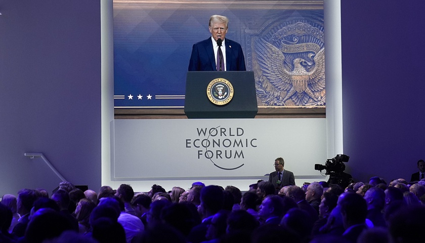 瑞士當?shù)貢r間1月23日,美國新任總統(tǒng)唐納德·特朗普通過視頻連線在達沃斯論壇發(fā)表講話。