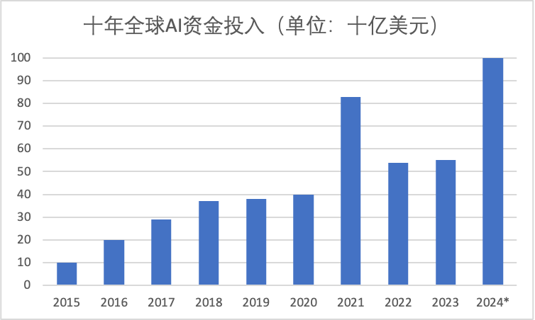 據(jù)第三方數(shù)據(jù)分析機(jī)構(gòu)Crunchbase數(shù)據(jù),截至2024年12月17日,2024年全球AI投資達(dá)到了1000億美元的歷史新高,比十年前增長了10倍。