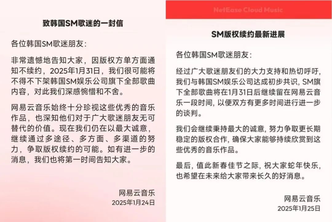 而此時居然天降大瓜。1月24日,網(wǎng)易云音樂發(fā)布《致韓國SM歌迷的一封信》,表示SM娛樂單方面通知不續(xù)約,平臺或?qū)⒂?月31日下架SM娛樂旗下全部歌曲。次日早八點,網(wǎng)易云再次發(fā)布事件進展,表示與SM娛樂達成初步共識,SM旗下全部歌曲將在1月31日后繼續(xù)留在網(wǎng)易云音樂一段時間,以便進行進一步談判。