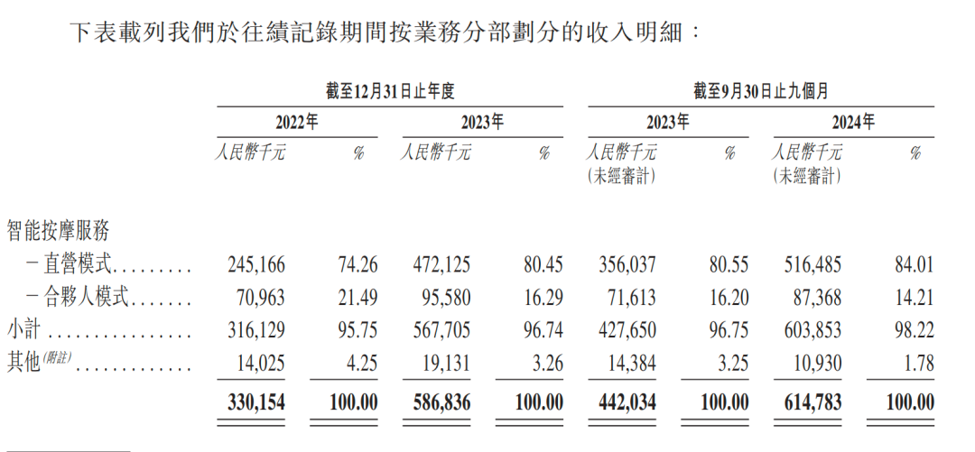 但毫無(wú)疑問(wèn),智能按摩服務(wù)是其業(yè)務(wù)核心。2022年、2023年及2024年前9個(gè)月(下稱“同期”),公司通過(guò)智能按摩服務(wù)分別實(shí)現(xiàn)收入3.16億元、5.68億元和6.04億元,占同期總收入的95.75%、96.74%和98.22%。