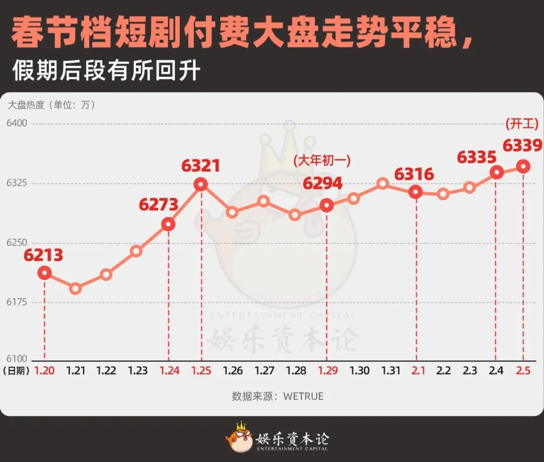 春節(jié)前,業(yè)內(nèi)預(yù)期單日付費(fèi)榜一熱力值至少能達(dá)千萬以上。但等到大年初一,大盤不僅毫無變化,榜一也只有500W左右的熱度,與節(jié)前持平。整個(gè)春節(jié)檔無一部全民級(jí)短劇出圈,整個(gè)大盤維持在6000萬多的熱度值,按付費(fèi)占比40%倒推春節(jié)檔八天,一共才12.6億左右的收入大盤,遠(yuǎn)遠(yuǎn)比不上95億的電影春節(jié)檔。