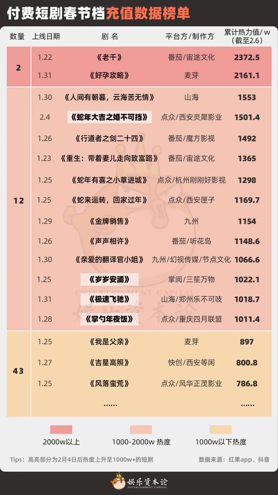 據(jù)娛樂資本論統(tǒng)計(jì),付費(fèi)領(lǐng)域表現(xiàn)最佳的是男頻短劇《老千》,再加上《好孕攻略》,也是今年唯二熱力值2000W以上的春節(jié)檔短劇。免費(fèi)領(lǐng)域以紅果短劇為主,截止至2月4日(大年初七)中午,熱度2000W以上的短劇有8部,還是《老千》以5500W熱度拔得頭籌。
