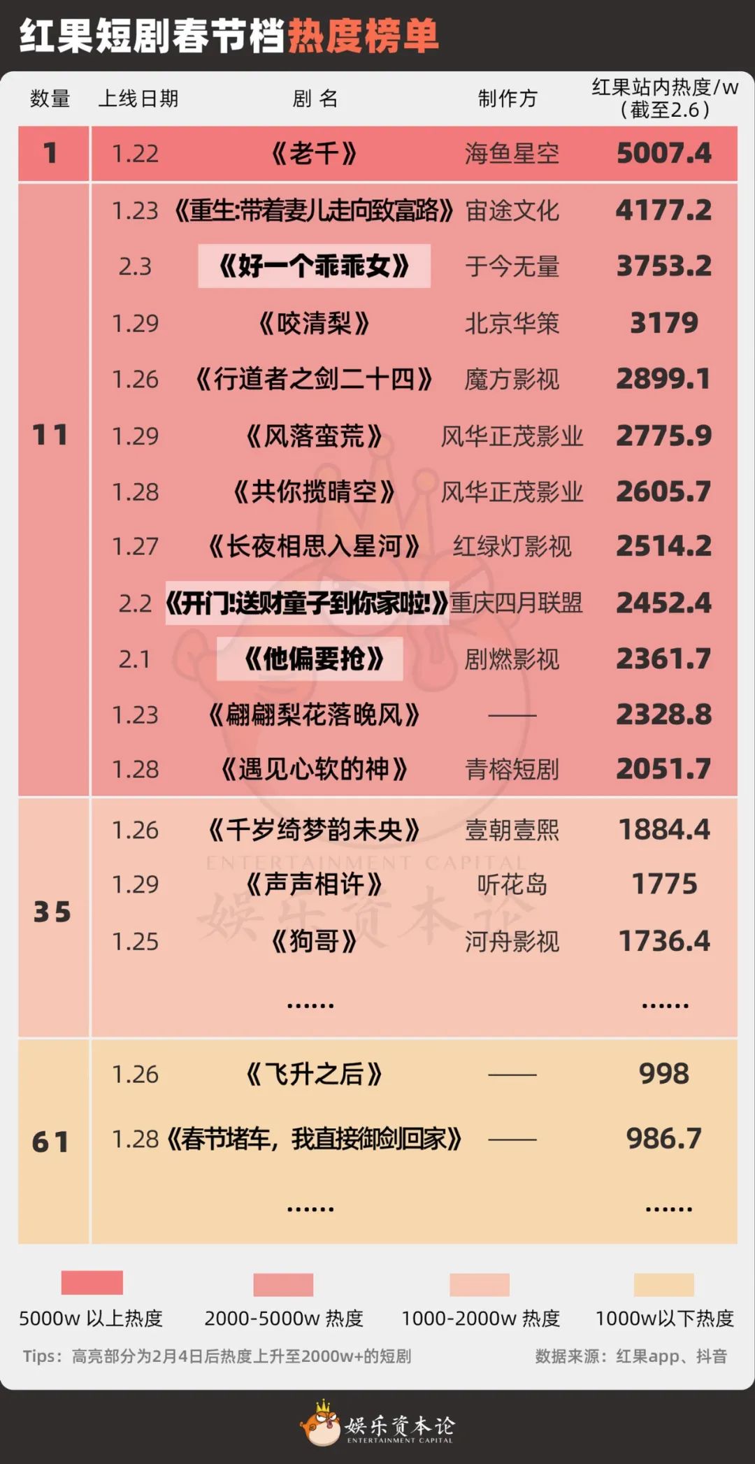 于今無量的《好一個(gè)乖乖女》在大年初六上線,開工第一天就在紅果上達(dá)到2000w熱度。重慶四月聯(lián)盟的《開門!送財(cái)童子到你家啦!》投流端僅有400萬,也是在昨日在紅果上的熱度漲到2000W以上。付費(fèi)榜上,2月4日上線的《蛇年大吉之婚不可擋》連續(xù)兩天榜一,總熱力值已經(jīng)攀升至1500w。