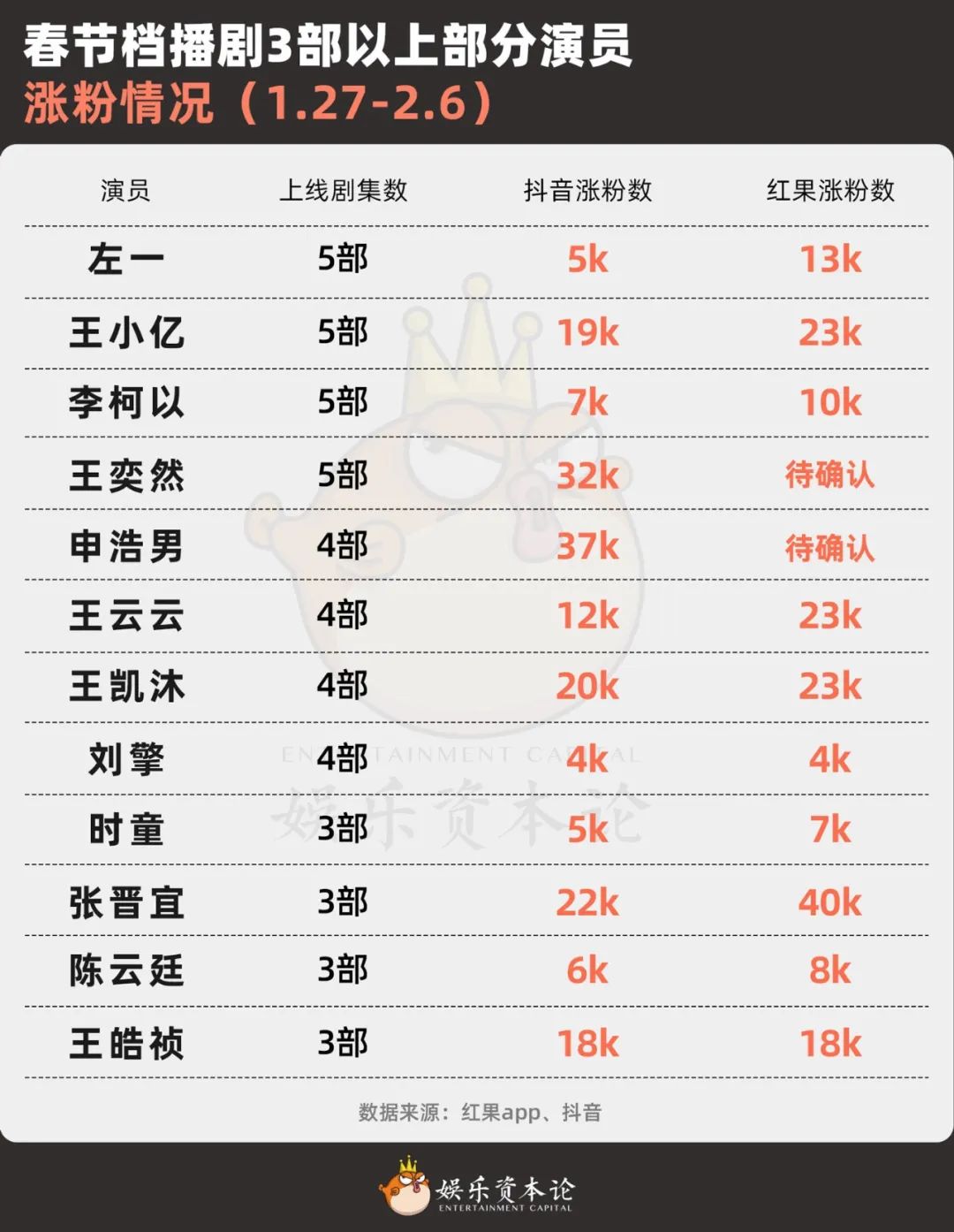 但此次春節(jié)檔,雖然頭部演員扎堆出演,漲粉效果卻不明顯。據(jù)娛樂資本論統(tǒng)計(jì),1月27日至2月6日期間,大部分出演3部以上的演員漲粉僅在5000至2萬之間。