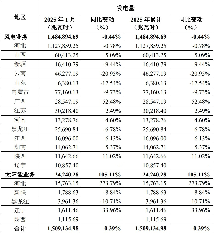 2月8日,新天綠能發(fā)布了《2025年1月主要經(jīng)營(yíng)數(shù)據(jù)公告》,披露了公司兩大業(yè)務(wù)板塊在1月份的經(jīng)營(yíng)概況。