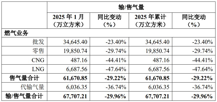 同時(shí),根據(jù)新天綠能初步統(tǒng)計(jì),2025年1月,本公司及子公司按合并報(bào)表口徑完成輸/售氣量67,707.21萬(wàn)立方米,同比減少29.96%,其中售氣量61,670.85萬(wàn)立方米,同比減少29.22%;代輸氣量6,036.35萬(wàn)立方米,同比減少36.74%。截至2025年1月31日,累計(jì)完成輸/售氣量67,707.21萬(wàn)立方米,同比減少29.96%,其中售氣量61,670.85萬(wàn)立方米,同比減少29.22%;代輸氣量6,036.35萬(wàn)立方米,同比減少36.74%。