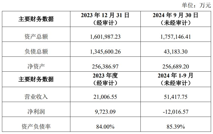 主要財(cái)務(wù)數(shù)據(jù)顯示,截至2024年9月30日,曹妃甸公司未經(jīng)審計(jì)的資產(chǎn)總額175.71億元,負(fù)債總額4.32億元,凈資產(chǎn)25.67億元;2024年1-9月,曹妃甸公司未經(jīng)審計(jì)的營(yíng)業(yè)收入5.14億元,凈利潤(rùn)虧損1.20億元,資產(chǎn)負(fù)債率85.39%。