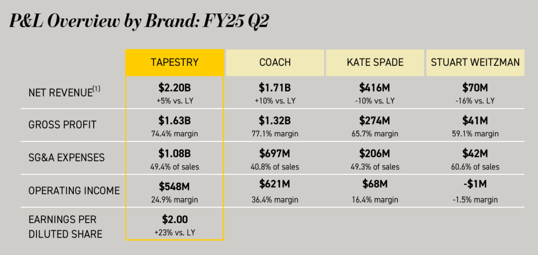 此外,Coach第二財(cái)季的營業(yè)收入、毛利潤、營業(yè)利潤同比增速均高于集團(tuán)整體水平。