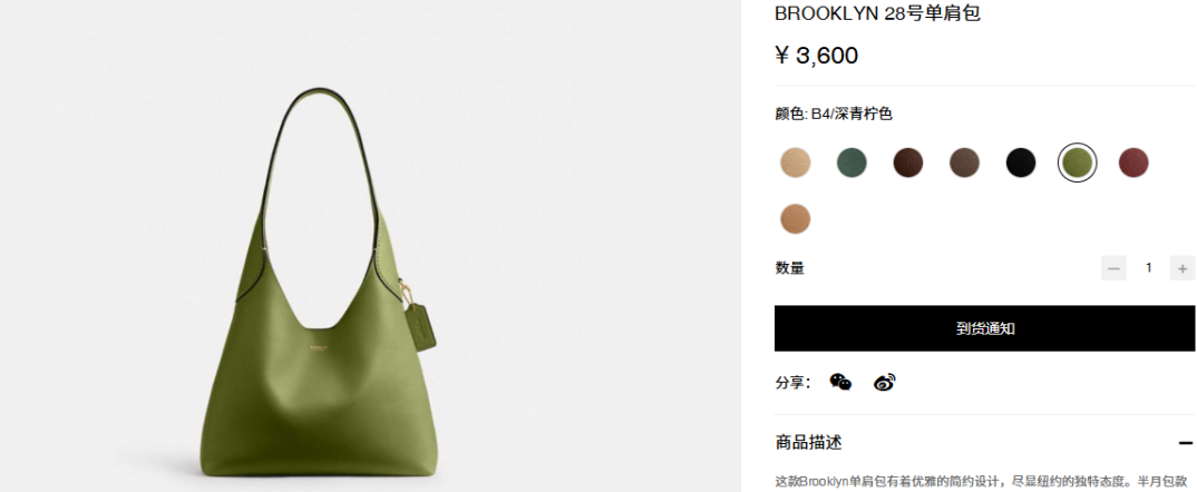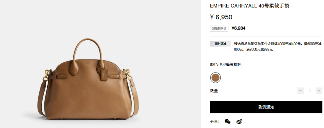 據(jù)源Sight了解,官價(jià)分別在2600-5600元、4950-7250元的Coach Brooklyn、Empire Carryall系列,此前實(shí)體店就出現(xiàn)熱門配色款需等貨近一個(gè)月的情況;目前在官網(wǎng)上,也存在相關(guān)配色款式缺貨情況。
