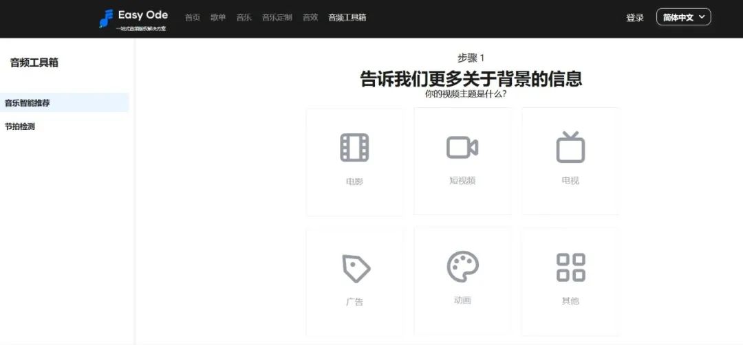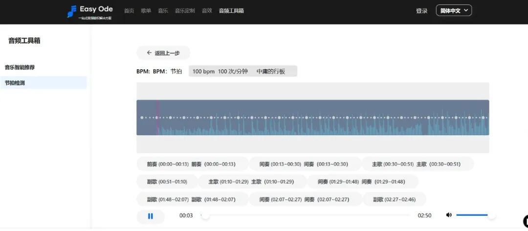 音頻工具箱就比較有意思了,分為音樂(lè)智能推薦和節(jié)拍檢測(cè)兩個(gè)選項(xiàng),用戶可以通過(guò)上傳視頻素材,EasyOde會(huì)自動(dòng)從其曲庫(kù)中推薦與視頻內(nèi)容視頻的曲目;用戶還可以通過(guò)節(jié)拍檢測(cè)工具上傳音頻,系統(tǒng)會(huì)自動(dòng)識(shí)別歌曲的整體結(jié)構(gòu)、BPM等。