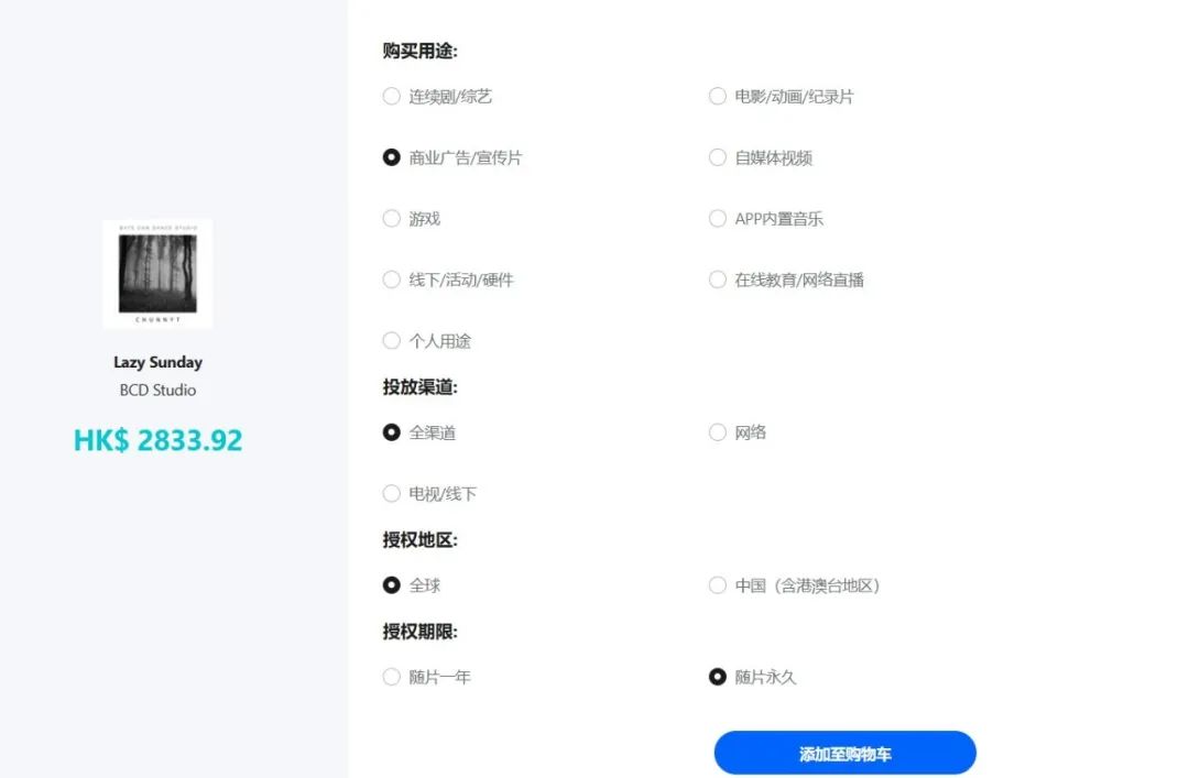目前,EasyOde的定價(jià)模式相對(duì)單一,僅限按需購(gòu)買、音樂(lè)定制。以平臺(tái)上的歌曲《Lazy Sunday》的商業(yè)廣告用途為例,若用戶選擇全渠道、全球授權(quán)、隨片永久的定價(jià)在2833.92元港幣(約2550人民幣)。