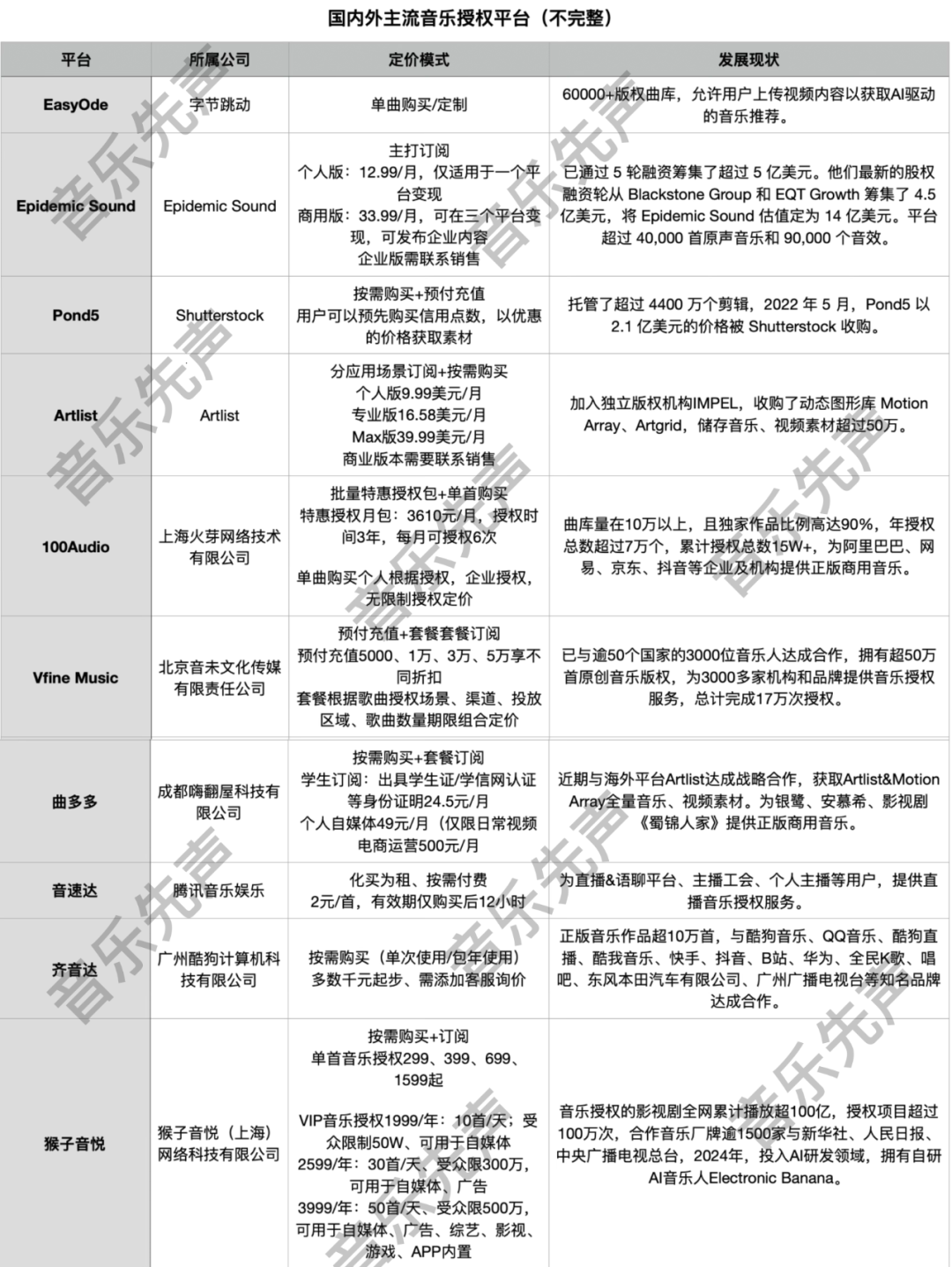如上圖所示,傳統(tǒng)音樂(lè)授權(quán)市場(chǎng)一直以來(lái)大多以三種付費(fèi)形式為主,預(yù)付費(fèi)、訂閱、按需購(gòu)買,比如Epidemic Sound的訂閱制(7.99-14.99美元/月),猴子音悅的年費(fèi)分級(jí)(1999-3999元/年),Pond5、Vfine Music不同折扣的預(yù)付充值,且?guī)缀跛衅脚_(tái)都支持根據(jù)授權(quán)場(chǎng)景、方式、地域、時(shí)間按需購(gòu)買。