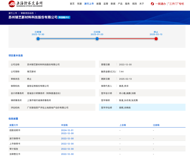沖刺兩年多,蘇州錦藝新材料科技股份有限公司及其保薦人,于2月13日主動撤回發(fā)行上市申請,上交所宣布終止其發(fā)行上市審核。