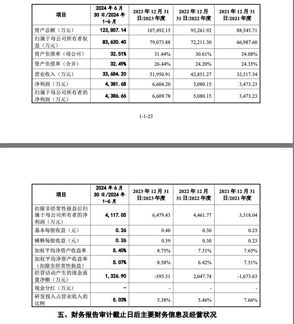 綜合多份招股書,2019-2023年及2024年上半年,錦藝新材的營業(yè)收入分別約為1.44億、2.12億、3.25億、4.29億、5.20億、3.37億元;凈利潤分別約為-212.69萬、485.77萬、3473.23萬、5080.15萬、6604.20萬、4381.68萬元;扣非歸母凈利潤分別約為-126.44萬、436.63萬、3318.04萬、4461.77萬、6479.43萬、4117.05萬元。