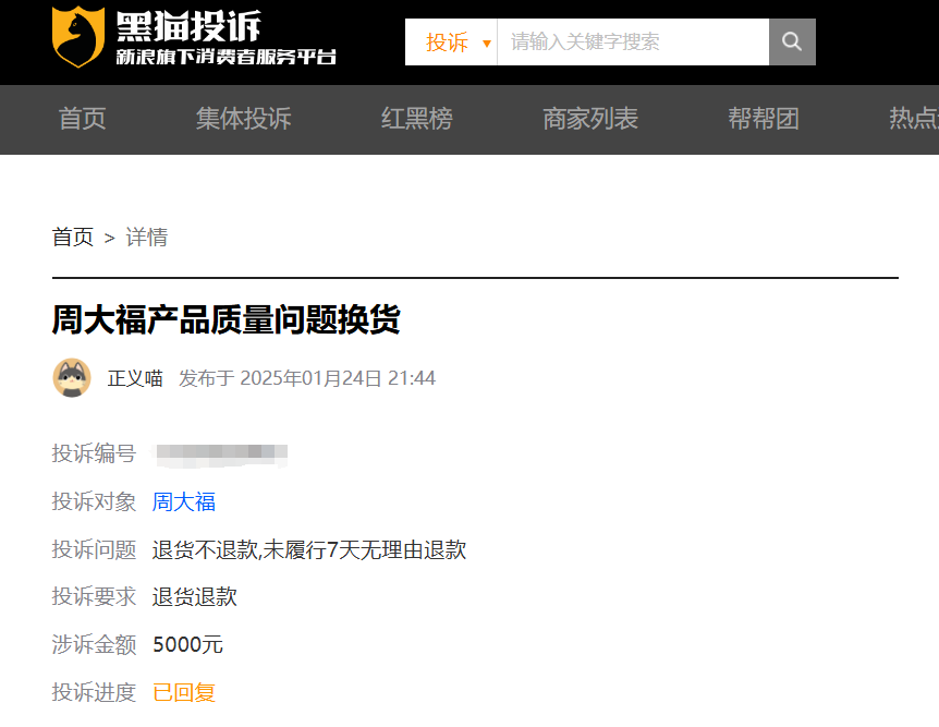 截至2025年2月17日,在黑貓投訴平臺上,有關(guān)周大福的投訴有5413條,周大生的投訴有2700條,六福珠寶的投訴有2341條。