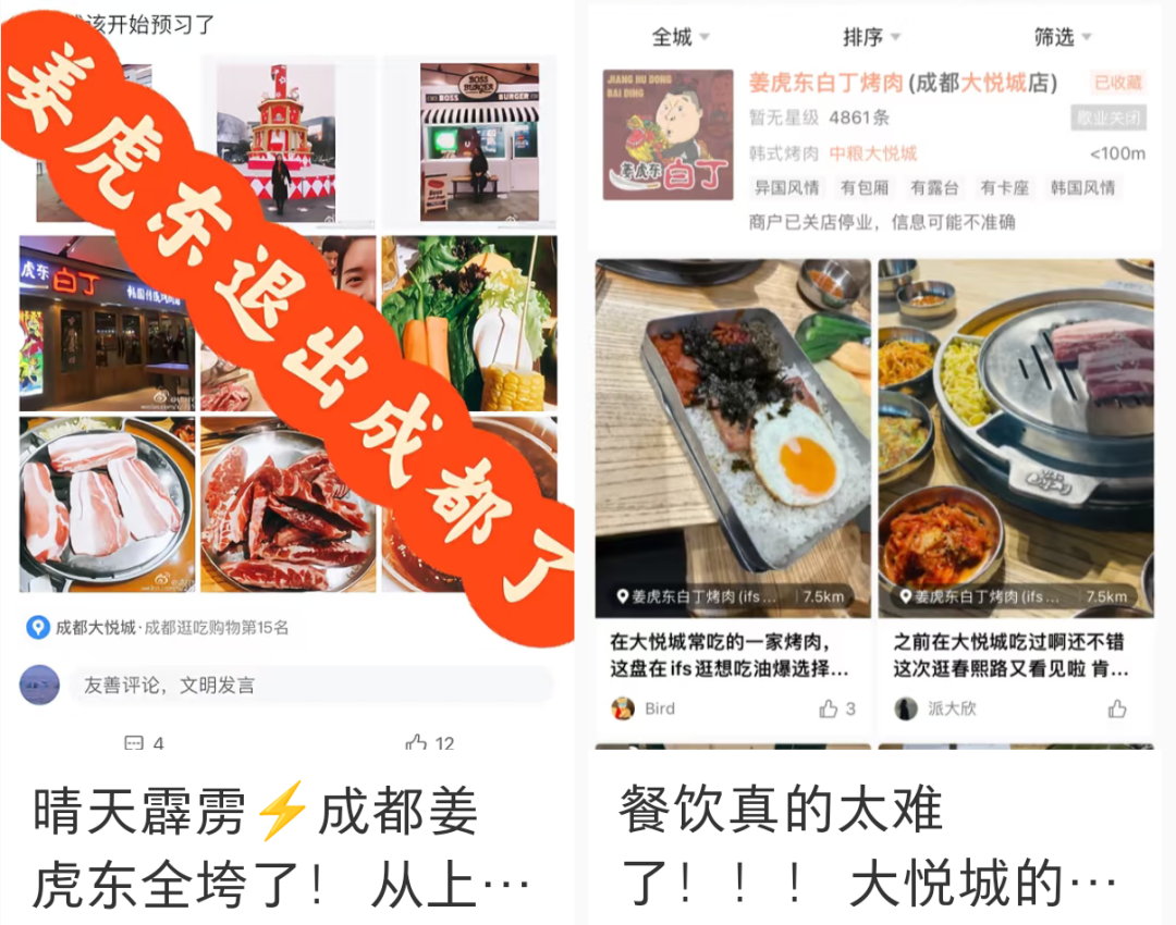 “成都姜虎東全垮了!”“姜虎東不聲不響離開成都了”。2月初,不少成都網(wǎng)友發(fā)帖稱,姜虎東烤肉在成都的3家店已經(jīng)全部停業(yè)了。