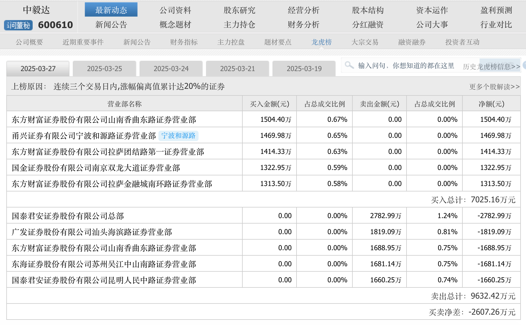 3月27日的連續(xù)3個交易日龍虎榜顯示,東方財富證券山南香曲東路營業(yè)部買入1504.4萬元,賣出1689.95萬元;甬興證券寧波和源路營業(yè)部買入1469.98萬元;東方財富證券另有兩個拉薩席位進入買入前五名單。賣出前五中,國泰君安總部甩了2782.99萬元籌碼,廣發(fā)證券汕頭海濱路營業(yè)部賣出1819.09萬元。