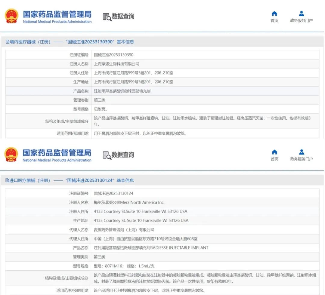 而隨著監(jiān)管政策的逐步完善和市場需求的升級,羥基磷灰石也于今年迎來了重大突破,在一月內(nèi)兩款產(chǎn)品相繼獲批:今年2月17日,國內(nèi)首款醫(yī)美用羥基磷灰石填充劑——上海摩漾生物的Aphranel 優(yōu)法蘭獲批;僅相隔18天,全球醫(yī)美巨頭梅爾茨北美公司的進(jìn)口同類產(chǎn)品Radiesse 瑞德喜也于3月7日通過國家藥監(jiān)局認(rèn)證。
