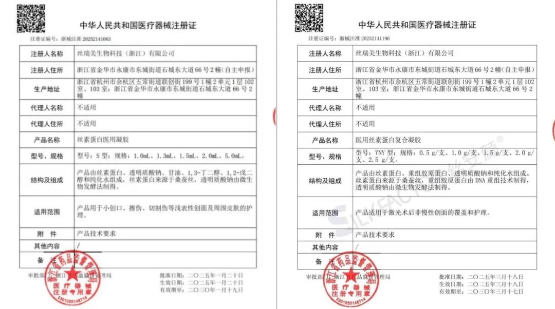 其中值得注意的是,近日,江蘇吳中宣布PDRN復(fù)合溶液產(chǎn)品完成全部臨床受試者入組,預(yù)計(jì)于下半年提交上市申請,2026年內(nèi)有望獲批,成為國內(nèi)首個合規(guī)PDRN械Ⅲ產(chǎn)品 ;瑞吉明生物也于日前宣布旗下人工合成PDRN產(chǎn)品中式成功;而星月生物更是在今年連續(xù)獲批兩款絲素蛋白凝膠產(chǎn)品:星月生物旗下全資子公司——絲瑞美生物自主研發(fā)的“絲素蛋白醫(yī)用凝膠”、“醫(yī)用絲素蛋白復(fù)合凝膠”,分別于今年1月20日和3月18日獲得浙江省藥監(jiān)局批準(zhǔn)。