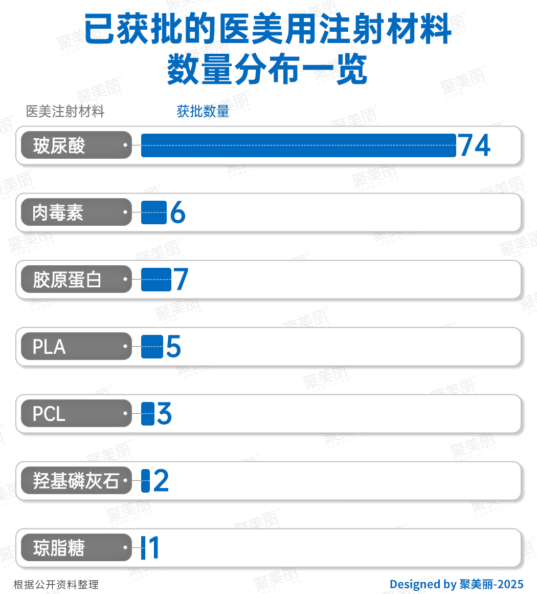 縱觀國內(nèi)醫(yī)美市場,合規(guī)的醫(yī)美用注射材料品類已達(dá)7種,包括玻尿酸、肉毒素、膠原蛋白三大傳統(tǒng)品類,PLA、PCL兩類再生材料,以及此次獲批的羥基磷灰石和瓊脂糖兩款新材料。