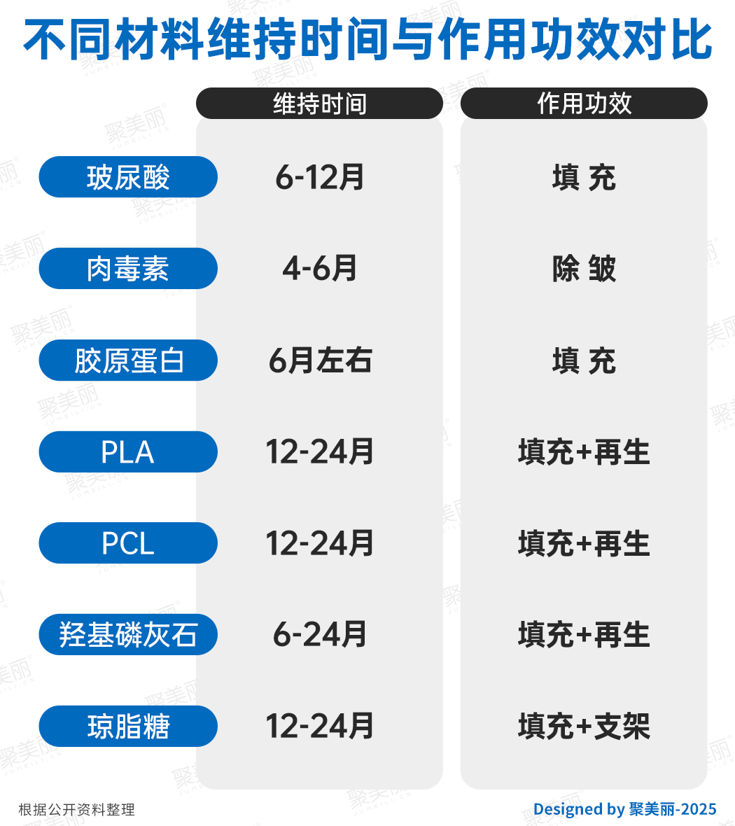 如前文所說,從已獲批的醫(yī)美注射材料來看,國內(nèi)整體上經(jīng)歷了“玻尿酸——肉毒素——(重組)膠原蛋白——再生類”的發(fā)展路徑。對比不同注射材料的維持時間和作用功效不難發(fā)現(xiàn),市場需求逐漸向“自然長效”傾斜,醫(yī)美消費(fèi)更加趨于理性。