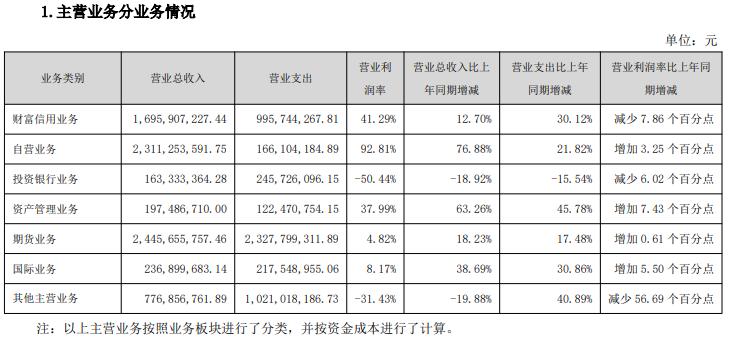 從主營(yíng)收入構(gòu)成來(lái)看,財(cái)富信用、自營(yíng)、資產(chǎn)管理、期貨、國(guó)際業(yè)務(wù)均實(shí)現(xiàn)同比增長(zhǎng),唯獨(dú)投行業(yè)務(wù)手續(xù)費(fèi)凈收入同比下降18.92%至2.02億元,為近年來(lái)最低水平。