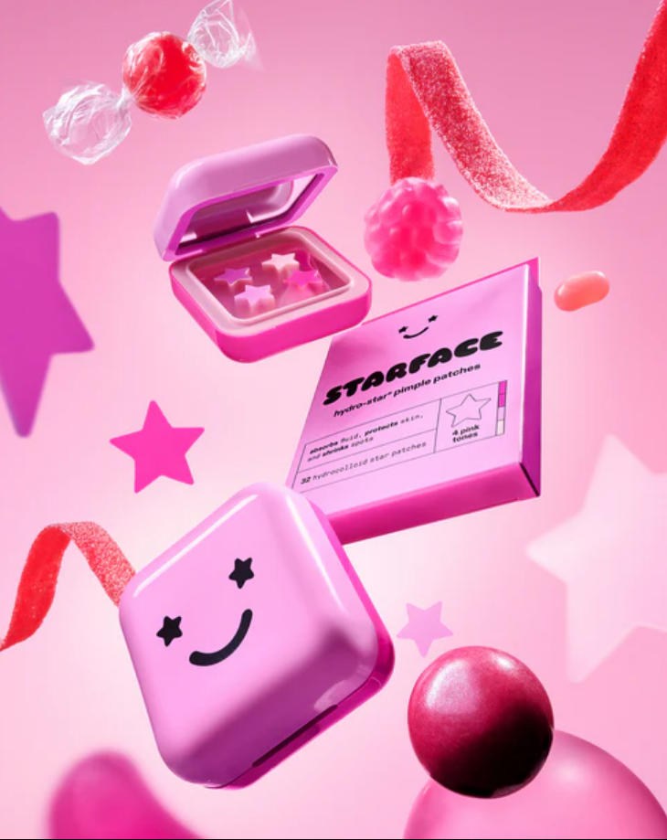 例如以其五顏六色的星形痘痘貼而聞名的痤瘡護理品牌Starface,其創(chuàng)始人朱莉·肖特(Julie Schott)介紹,該品牌試圖打造給消費者的視覺印象是“柔軟、圓潤、舒適”,為此,品牌采用了圓潤、蓬松感的字體設計。