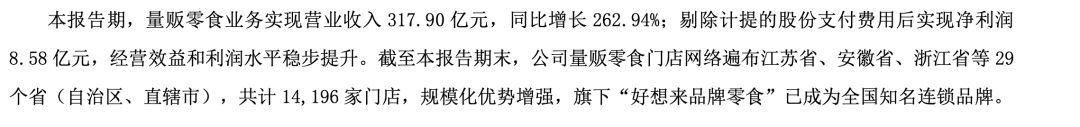近日,量販零食品牌“好想來”背后的上市公司萬辰集團(tuán)公布2024年財報,量販零食業(yè)務(wù)實(shí)現(xiàn)營收317.9億元,同比增長262.94%,占總營業(yè)收入的98.33%;剔除計提的股份支付費(fèi)用后實(shí)現(xiàn)凈利潤8.58億元,同比增長了2500%。