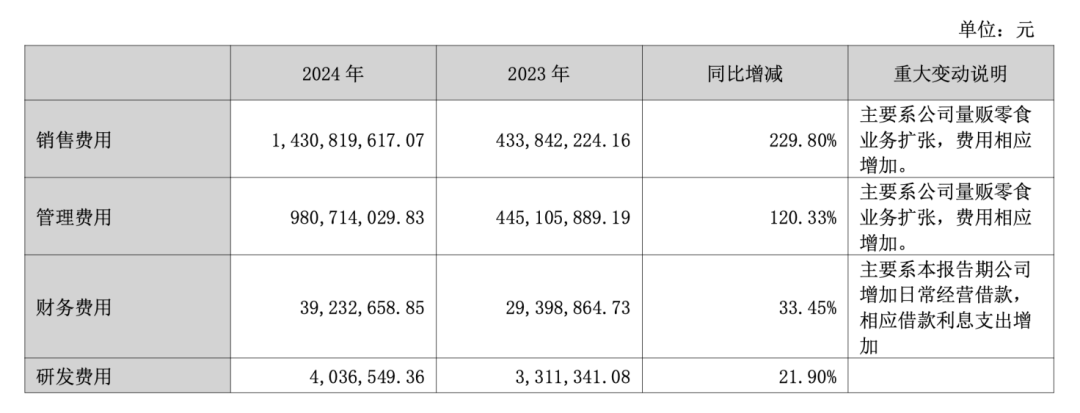 一通操作下來,萬辰集團(tuán)各項(xiàng)支出大增。2024年,其銷售費(fèi)用達(dá)到14.31億元,2023年僅為4.34億元,同比暴漲229.8%;管理費(fèi)用也從4.45億元增長至9.81億元,同比大增120.33%。