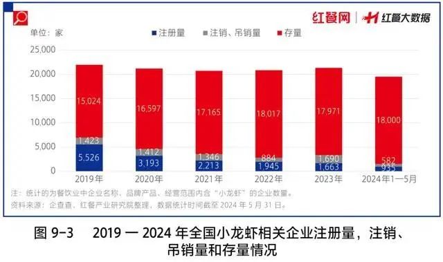 而從整個(gè)行業(yè)來看,經(jīng)歷過前些年的“小龍蝦頂流”時(shí)期,近幾年這個(gè)賽道的增速已稍有下滑。據(jù)紅餐網(wǎng)2024年報(bào)道,截至2024年9月上旬,我國(guó)小龍蝦相關(guān)企業(yè)注冊(cè)量為1442家,同比減少5.2%;小龍蝦相關(guān)企業(yè)存量為17900家,同比減少3.2%。