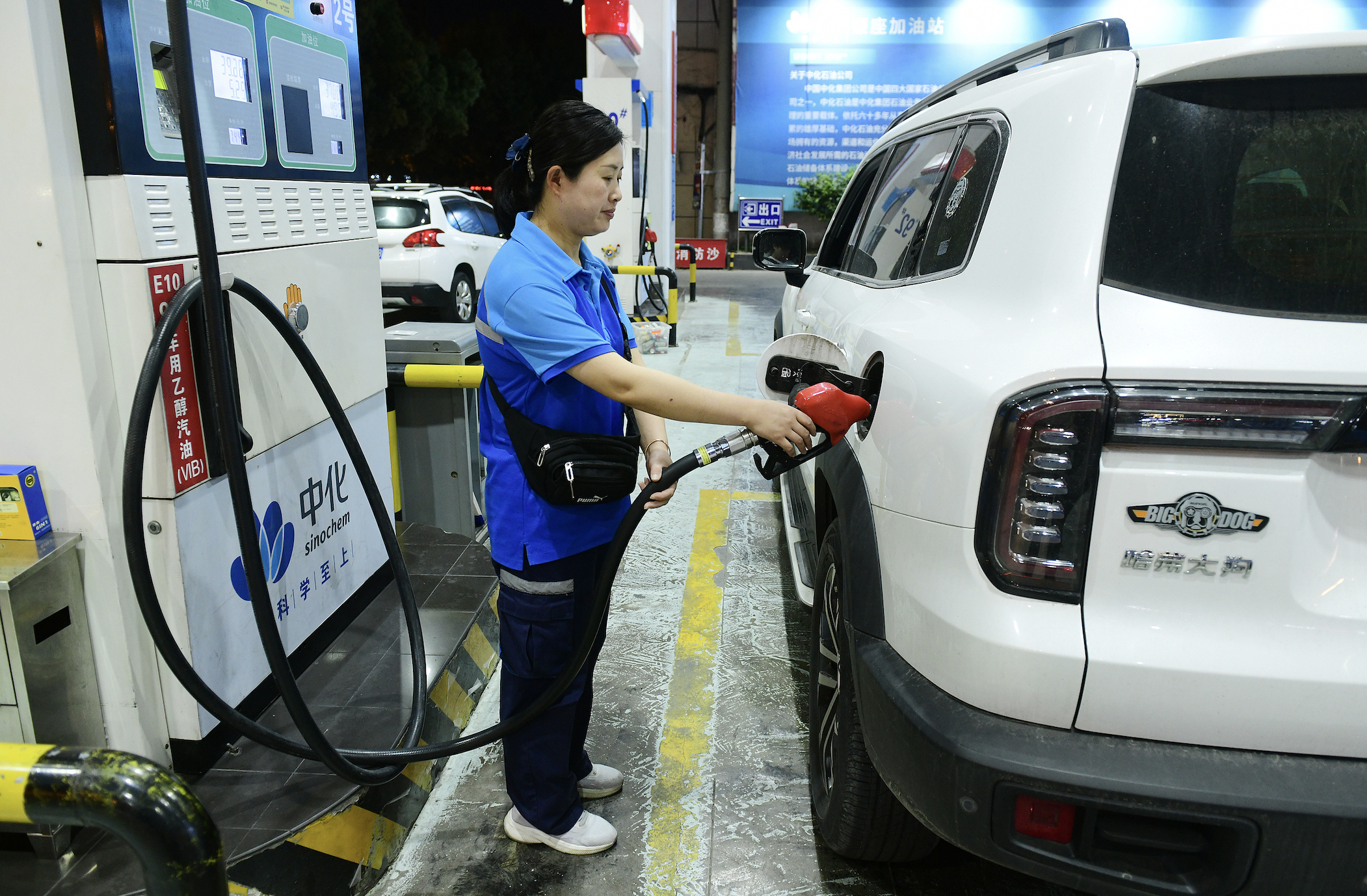 2025年4月17日夜晚,在安徽省阜陽(yáng)市阜南路一加油站內(nèi),工作人員給車(chē)輛加油。圖片來(lái)源:CFP