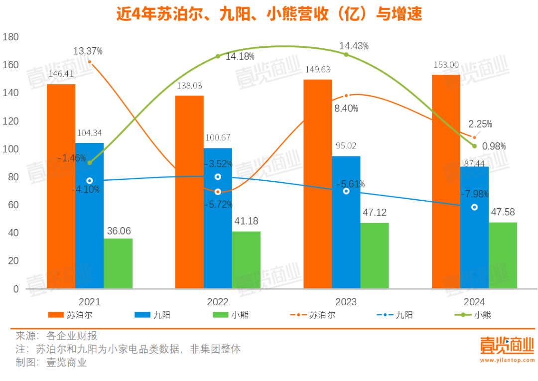 從小家電板塊的營(yíng)收看,蘇泊爾、九陽、小熊2024年?duì)I收分別為153億、87.44億、47.58億,蘇泊爾位列榜首,九陽從2023年便退出“百億隊(duì)伍”,2024年的營(yíng)收進(jìn)一步下跌,小熊營(yíng)收維持穩(wěn)定。