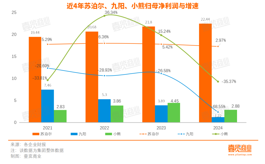 具體的,蘇泊爾以22.44億元?dú)w母凈利潤(rùn)領(lǐng)跑,利潤(rùn)規(guī)模是其余兩家之和,而且,只有蘇泊爾的歸母凈利潤(rùn)上漲,九陽和小熊的歸母凈利潤(rùn)增速都有不同程度的下跌。其中,九陽下跌幅度最大,達(dá)68.55%;小熊則是近3年第一次下跌,達(dá)35.37%。